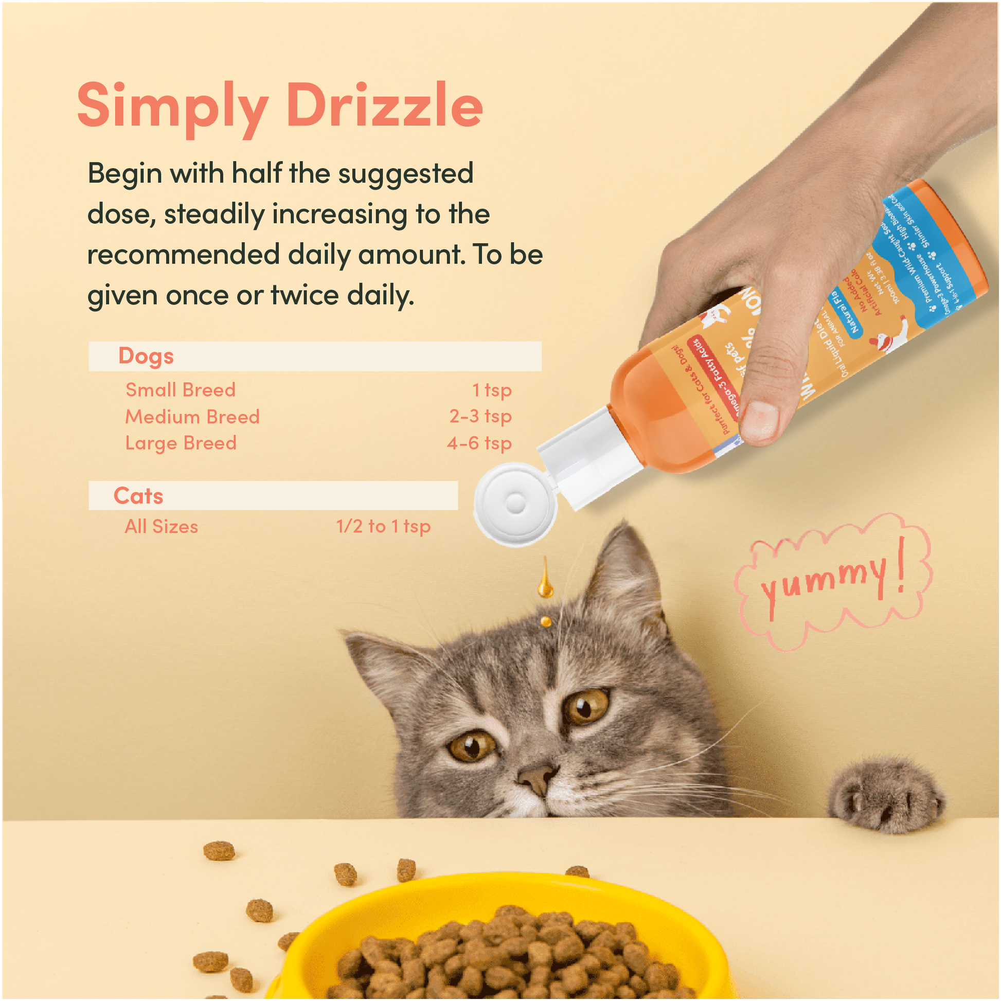 Gently drizzle the recommended amount of salmon oil over your pet’s food at mealtime. Start with a smaller amount if introducing for the first time, then gradually increase to the full dose. Give once or twice a day.