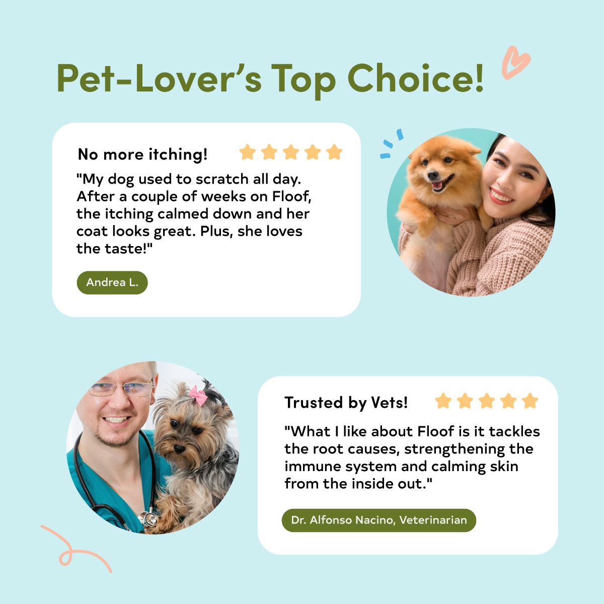 “My dog used to scratch nonstop. After a few weeks on Floof, the itching eased up and her coat looks amazing. Plus, she loves the taste!”