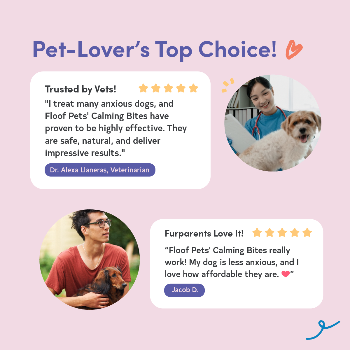 “Floof Pets' Calming Bites really work! My dog is less anxious, and I love how affordable they are. 🐕👍”